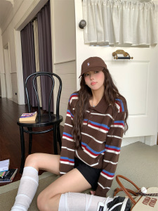 美式2025秋季韩版学院风设计纽扣polo领条纹针织衫长袖针织衫毛衣
