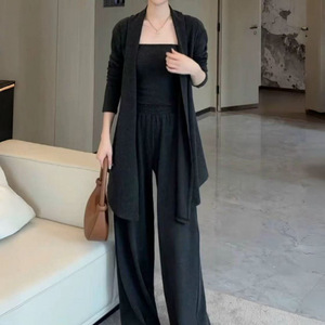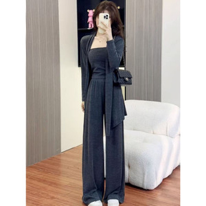 一整套早秋穿搭女装减龄开衫抹胸阔腿裤三件套慵懒风运动休闲套装