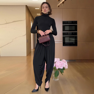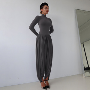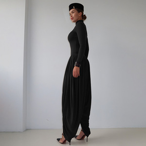 欧美风2025秋季外贸新款个性街头创意半高领长袖褶皱拼接连体裤女