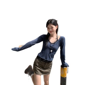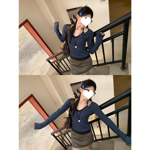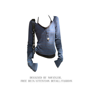 大码胖MM韩系辣妹风假两件条纹拼接T恤女秋季新款修身设计感上衣