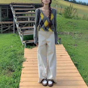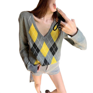 秋季甜奏 菱格美学复古菱形格针织毛衣灰色其他肩带款常规波浪