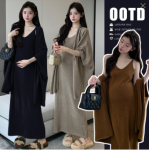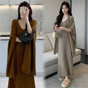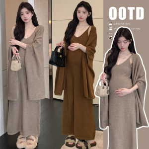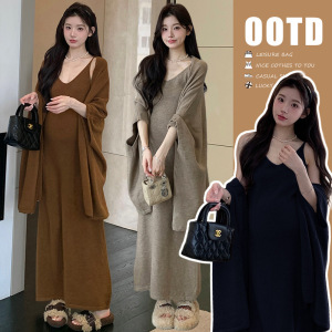 孕妇秋冬韩版新款针织时尚辣妈吊带毛衣连衣裙+慵懒风披肩两件套