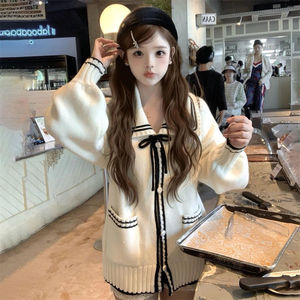 韩系学院风甜美撞色翻领针织毛衣开衫女学生秋冬新款宽松显瘦外套
