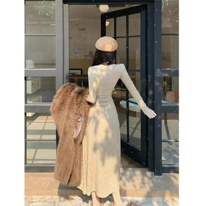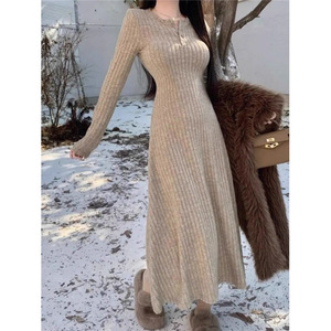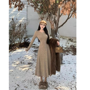 女洋气V领收腰修身针织打底裙纯色连衣裙中长裙法式气质针织春秋