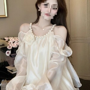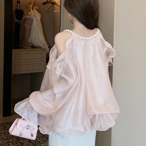 荷叶边超仙衬衫女秋季法式绝美挂脖上衣宫廷风一字肩雪纺衬衣新款