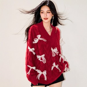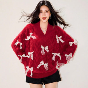 R5615气质露肩新年战袍红色蝴蝶结毛衣女设计感慵懒风针织衫潮