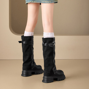 支持定制靴子长筒靴女2025新款百搭皮带扣褶皱堆堆靴中筒裤管靴