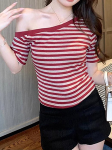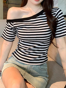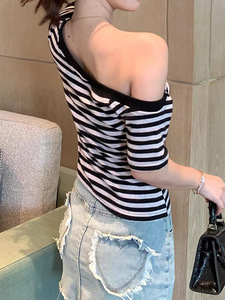 纯欲风ins辣妹露肩条纹短袖T恤女2025夏季新款修身打底时尚上衣女