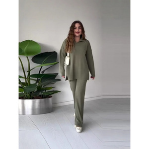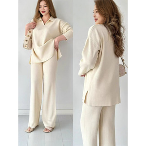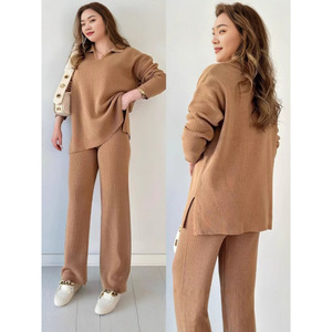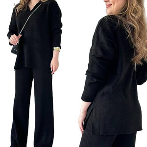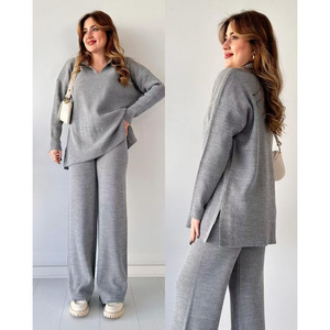 秋冬季新款欧美亚马逊跨境时尚纯色宽松下摆开叉针织衫两件套女