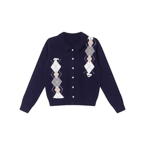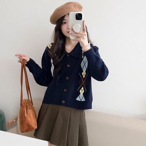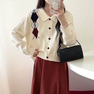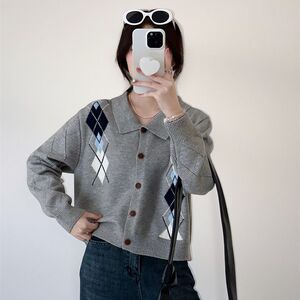 韩系慵懒高级感菱格POLO领毛衣外套女宽松春秋装新款百搭针织开衫