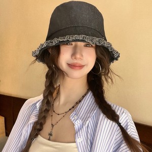 韩版甜美格子花边牛仔渔夫帽子女早秋天百搭优雅盆帽显脸小水桶帽