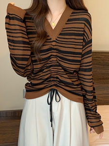 条纹V领打底针织衫毛衣女早秋季大码胖mm显瘦设计感短款抽绳上衣
