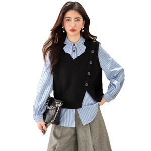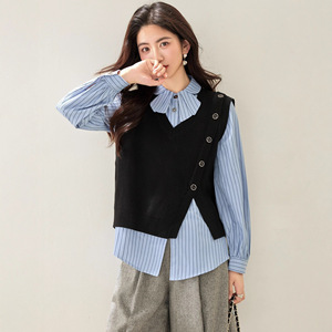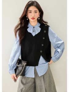 蓝色长袖衬衫女秋季新款气质女士针织马甲外穿女叠穿显瘦衬衣7159