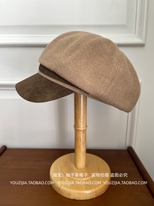 栗子拿铁~2025新款秋冬毛呢pu皮拼接贝雷帽女气质复古时尚八角帽