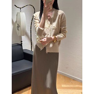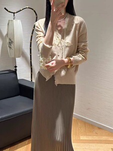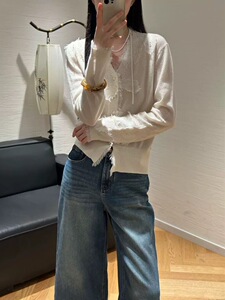 100山羊毛V领针织开衫女薄款秋季新款高感软糯立体刺绣钩花毛衣