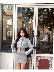 高品质~2025秋季新款灰色自带领结polo领短款卫衣短裙套装两件套