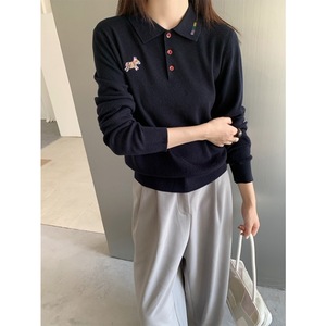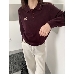 2025秋季新款韩版减龄Polo领彩条刺绣针织衫女半系扣套头长袖显瘦