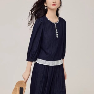 休闲松弛感套装女2025初秋新款七分袖刺绣上衣阔腿裤两件套