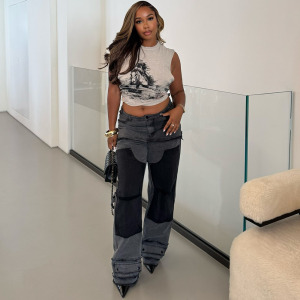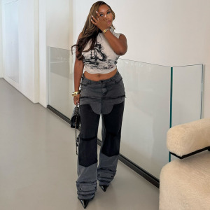 欧美女式休闲牛仔裤 亚马逊跨境新款女装街头时尚贴布拼接多袋裤