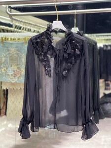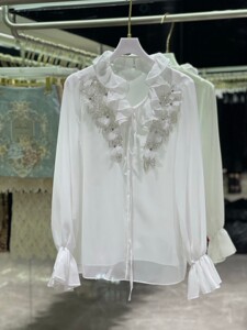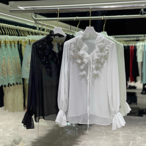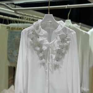 2025秋季新款简约荷叶边V领长袖单排扣设计钉珠纯色衬衣上衣批发