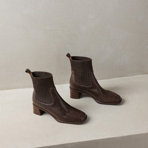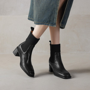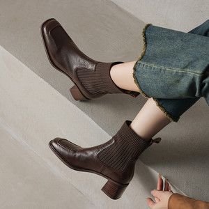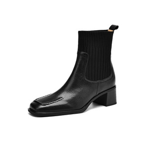 法式复古针织筒弹力瘦瘦靴女秋冬羊皮方头显瘦马丁靴厚底粗跟瘦瘦