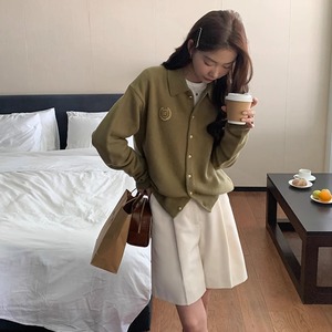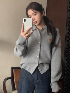 灰色刺绣POLO翻领毛衣外套女秋冬复古慵懒宽松外穿感针织开衫