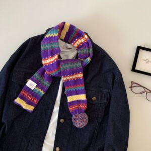 2025新/ 复古费尔岛毛球围巾彩虹色条纹可爱短款秋冬保暖围脖女韩