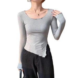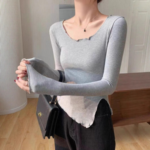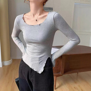不规则开叉打底衫紧身女纯欲风低领高腰长袖木耳边款T恤上衣潮