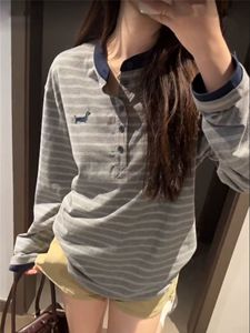 韩系复古拼接可爱小狗条纹亨利领长袖t恤女春秋原宿风薄款上衣潮
