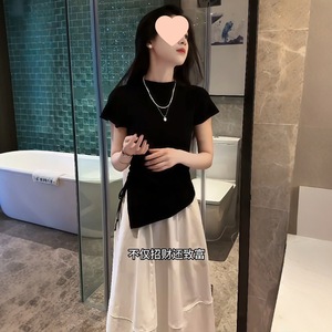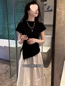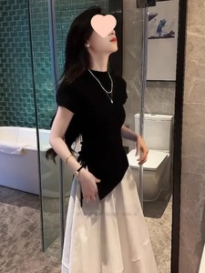 黑色修身掐腰开叉正肩短袖恤女夏2025新款不规则设计感针织上衣