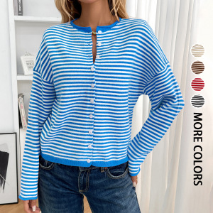 跨境欧美女装2025秋冬新款针织条纹开衫休闲长袖圆领纽扣开衫毛衣