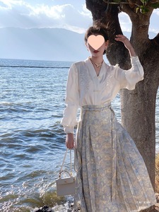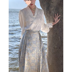 大码胖春季新款新中式刺绣长袖衬衫+气质国风马面裙显瘦两件套