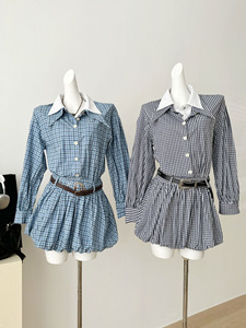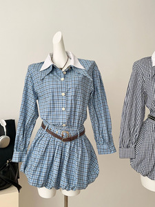 吞吞TUNTTiutiu格子裙 蓝白缪系学院 假两件翻领衬衫连衣裙
