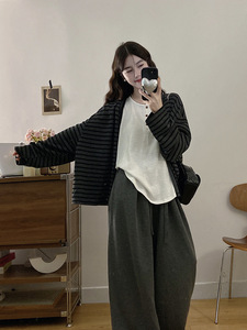2025大码女装秋季慵懒风美式撞色条纹长袖内搭背心+休闲长裤套装