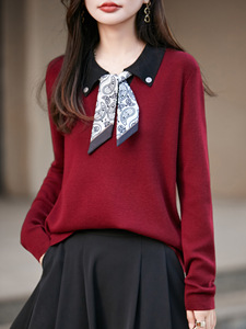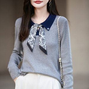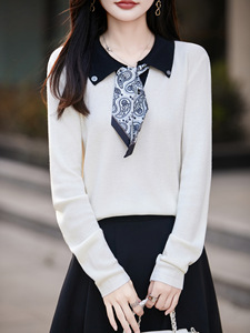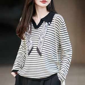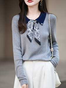 polo领丝带长袖针织衫早秋新款气质减龄打底衫女翻领短款上衣t恤