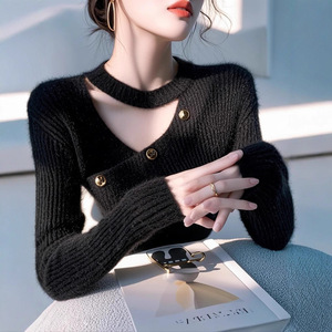 秋冬独特别致白色镂空挂脖毛衣针织衫女设计感小众超好看长袖上衣