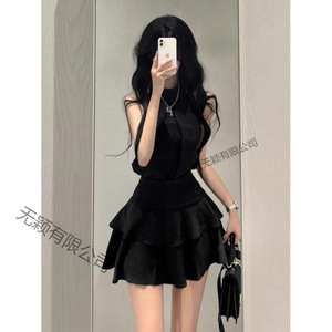 无袖挂脖背心上衣女夏季小个子套装荷叶边蛋糕半身短裙气质两件套