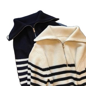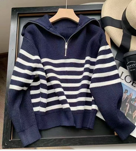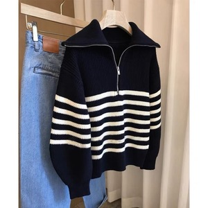 法式复古翻领半拉链撞色条纹毛衣女秋季慵懒风套头内搭针织打底衫
