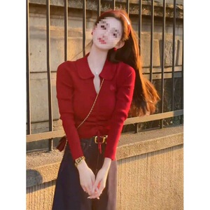 法式复古红色polo领针织衫女秋季2025新款韩系修身显瘦内搭打底衫