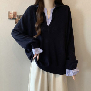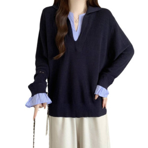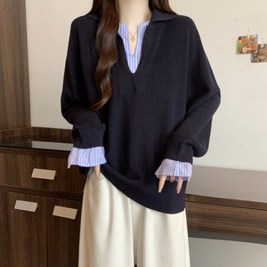 2025大码胖mm撞色拼接假两件上衣秋季新款正肩显瘦长袖针织衫