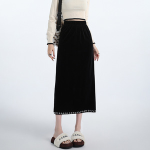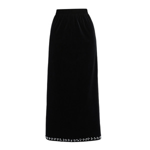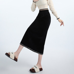 丝绒钉珠半身裙女秋冬加绒高腰显瘦后开叉一步裙复古中长款包臀裙