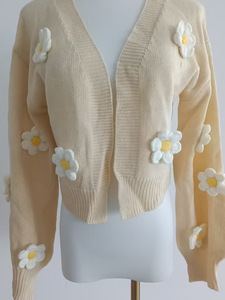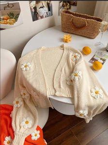 韩版立体刺绣花朵灯笼袖毛衣宽松秋冬针织衫跨境毛衣开衫外套女