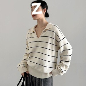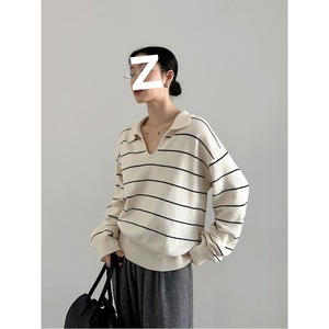 小麦家/老钱风复古撞色条纹翻领针织衫女春秋新款撞色条纹套头女