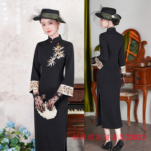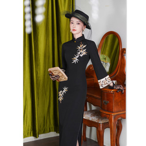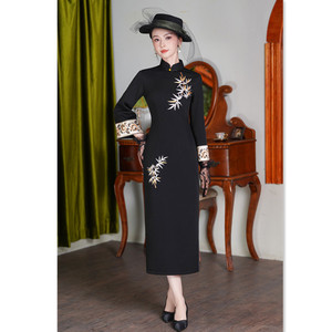 刺绣时尚拼接长款倒大袖加绒旗袍2025秋季新款改良新中式超柔旗袍
