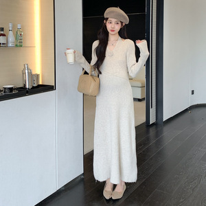 孕妇连衣裙秋冬季孕妈法式穿搭高级感花朵刺绣打底修身针织长裙子