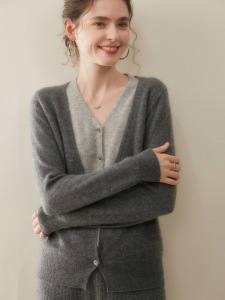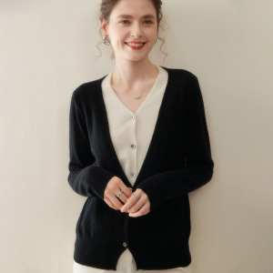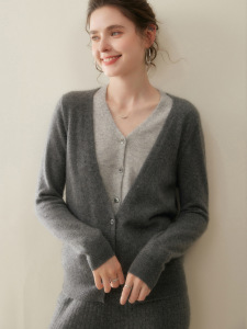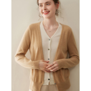 2025新款假两件羊绒开衫女法式复古V领拼色山羊绒针织上衣外套