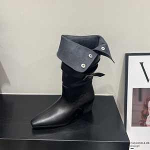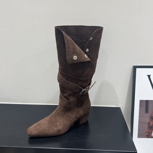 高跟绒面尖头堆堆靴中筒骑士靴女靴子2025秋冬季棕色长筒瘦瘦长靴