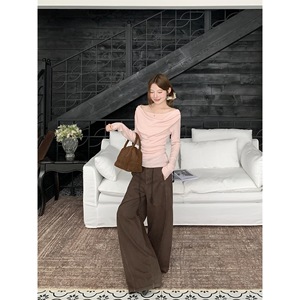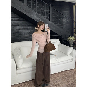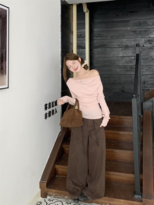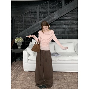 实拍~早秋法式设计感一字肩收腰荡领上衣+高腰复古宽松阔腿裤套装