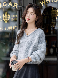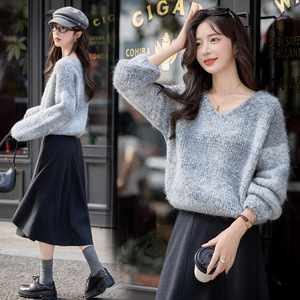 女式针织衫2025新款秋冬时尚套头纯色慵懒v领宽松软糯毛衣 ZQ5128