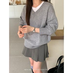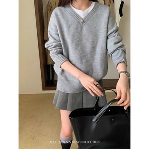 灰色套头圆领2025年秋冬季新款v领宽松慵懒风衣毛衣百搭针织上衣